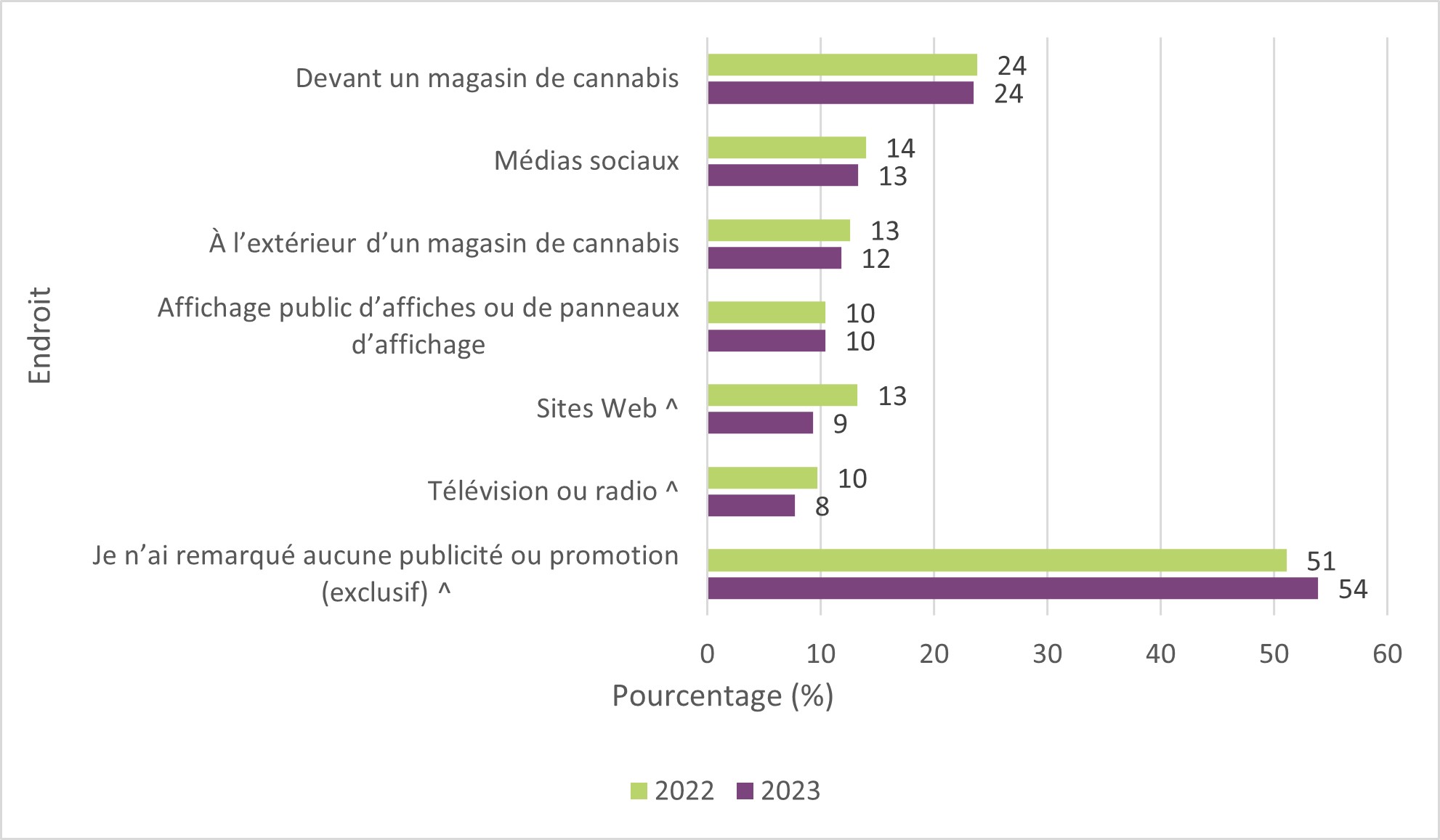 | Apparition tardive des effets des produits comestibles | s/o | s/o | 52 | 50 | 52 | 51 |