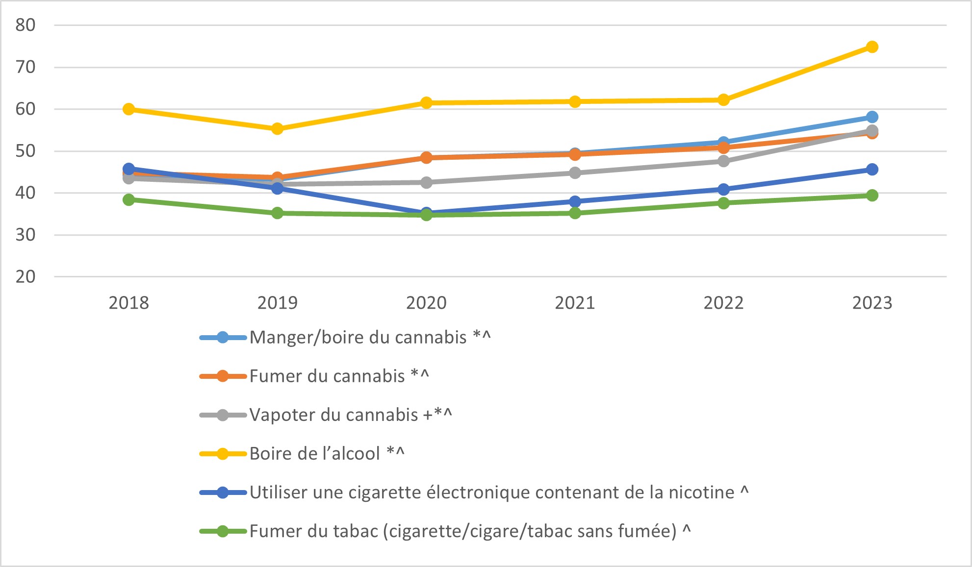 | Consommation fréquente et santé mentaleFigure 1 Note de bas du tableau *,Figure 1 Note de bas du tableau ^ | s/o | 89 | 66 | 65 | 66 | 68 |