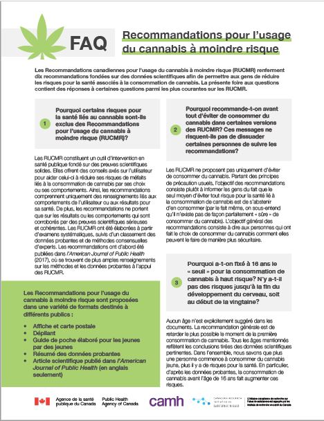Les Recommandations canadiennes pour l’usage du cannabis à moindre risque (RUCMR) renferment dix recommandations fondées sur des données scientifiques afin de permettre aux gens de réduire les risques pour la santé associés à la consommation de cannabis. La présente foire aux questions contient des réponses à certaines questions parmi les plus courantes sur les RUCMR.