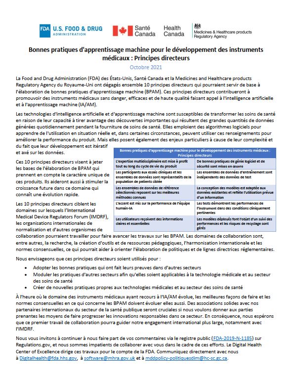 La Food and Drug Administration (FDA) des États-Unis, Santé Canada et la Medicines and Healthcare products Regulatory Agency du Royaume-Uni ont dégagés ensemble 10 principes directeurs qui pourraient servir de base à l'élaboration de bonnes pratiques d'apprentissage machine (BPAM). Ces principes directeurs contribueront à promouvoir des instruments médicaux sans danger, efficaces et de haute qualité faisant appel à l'intelligence artificielle et à l'apprentissage machine (IA/AM).