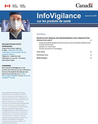 L'InfoVigilance sur les produits de santé est une publication mensuelle qui s'adresse principalement aux professionnels de la santé. Il présente des renseignements cliniques utiles sur l'innocuité, notamment en ce qui concerne les produits pharmaceutiques, les produits biologiques, les matériels médicaux et les produits de santé naturels.
