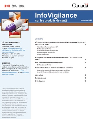Cette publication mensuelle s'adresse principalement aux professionnels de la santé et contient des informations sur les produits pharmaceutiques, biologiques, les matériels médicaux et les produits de santé naturels. Elle fournit un résumé des informations clés concernant l'innocuité des produits de santé qui ont été publiés au cours du mois précédent par Santé Canada, ainsi qu'une sélection de nouveaux renseignements en matière d'innocuité sur les produits de santé, pour en accroître la sensibilisation. Les nouvelles informations contenues dans ce numéro ne sont pas exhaustives, mais représentent plutôt une sélection de problèmes d'innocuité cliniquement pertinents, justifiant une dissémination améliorée.