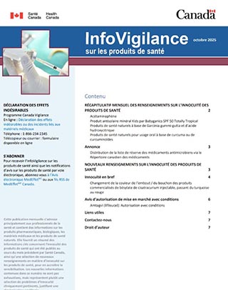 Cette publication mensuelle s’adresse principalement aux professionnels de la santé et contient des informations sur les produits pharmaceutiques, biologiques, les matériels médicaux et les produits de santé naturels. Elle fournit un résumé des informations clés concernant l’innocuité des produits de santé qui ont été publiés au cours du mois précédent par Santé Canada, ainsi qu’une sélection de nouveaux renseignements en matière d’innocuité sur les produits de santé, pour en accroître la sensibilisation. Les nouvelles informations contenues dans ce numéro ne sont pas exhaustives, mais représentent plutôt une sélection de problèmes d’innocuité cliniquement pertinents, justifiant une dissémination améliorée.