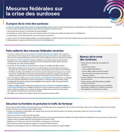 Mesures fédérales sur la crise des surdoses | Cet aperçu identifie les mesures prises par le gouvernement du Canada depuis le début de 2016 pour répondre à la crise des surdoses. Il donne également un survol national de l'incidence des opioïdes sur la santé publique au Canada. |