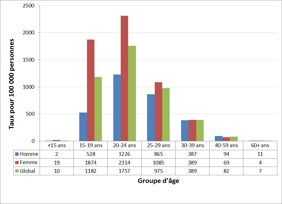 En 2016, les taux les plus élevés ont été observés chez les 15-19 ans, 20-24 ans et 25-29 ans (Figure 2). Dans l'ensemble, les cas chez les 15 à 29 ans représentaient 76 % du total des cas de chlamydiose déclarés en 2016, comme en 2015, alors qu'ils ne représentaient que 19 % de la population totale.