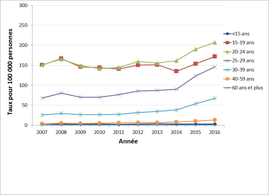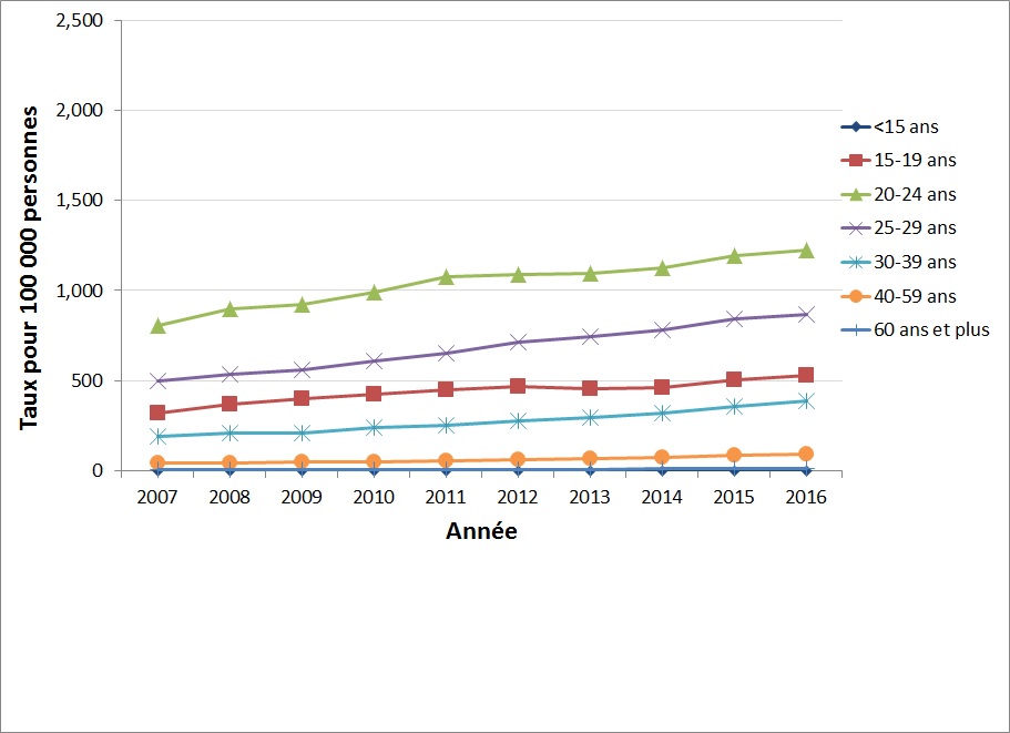 De 2007 à 2016, chez les hommes, le groupe affichant le taux le plus élevé était celui des 20-24 ans, suivi du groupe des 25-29 ans (Figure 3) tandis que les hausses les plus élevées des taux ont été observées chez les 40 ans et plus. Chez les femmes, le groupe affichant les taux les plus élevés était celui des 20 à 24 ans, suivi du groupe des 15 à 19 ans (Figure 4). Les hausses les plus élevées des taux chez les femmes ont également été observées chez les 40 ans et plus.