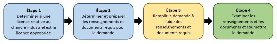 Il est important de signaler que les activités liées au chanvre industriel ne sont pas toutes visées par le Règlement sur le chanvre industriel. Par exemple, l'extraction du CBD ou d'un autre phytocannabinoïde des têtes florales, des feuilles et des branches de la plante relève du Règlement sur le cannabis et exige une licence de transformation du cannabis. Ainsi, avant de déposer une demande de licence, le demandeur doit d'abord déterminer si une licence relative au chanvre industriel est la licence appropriée pour les activités proposées. La figure 1 décrit le processus de demande d'une licence relative au chanvre industriel.