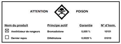 Encadré représentant un exemple d'autocollant pour boîte d'appât et montrant les éléments qu'on devrait y retrouver : le nom du produit, le nom du principe actif, la garantie, le numéro d'homologation, la mention « AVERTISSEMENT- POISON », et le symbole composé d'un crâne de squelette et de deux tibias croisés.
