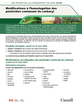 Décision de réévaluation RVD2016-02, Carbaryl. L’étiquette approuvée par Santé Canada constitue le document officiel pour l’application de la loi. En cas de disparité avec le contenu de la présente fiche d’information, les renseignements sur l’étiquette prévalent.