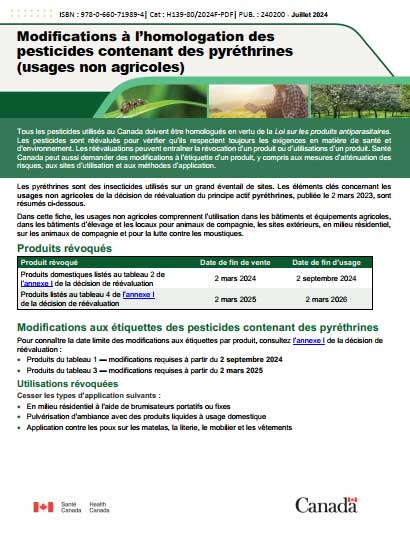 Décision de réévaluation RVD2023-06, Pyréthrines et préparations commerciales connexes. L'étiquette approuvée par Santé Canada constitue le document officiel pour l'application de la loi. En cas de disparité avec le contenu de la présente fiche d'information, les renseignements sur l'étiquette prévalent.