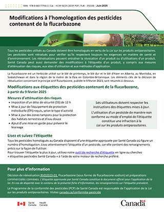 Décision de réévaluation RVD2023-03, Flucarbazone (sous forme de flucarbazone-sodium) et préparations commerciales connexes. L’étiquette approuvée par Santé Canada constitue le document officiel pour l’application de la loi. En cas de disparité avec le contenu de la présente fiche d’information, les renseignements sur l’étiquette prévalent.