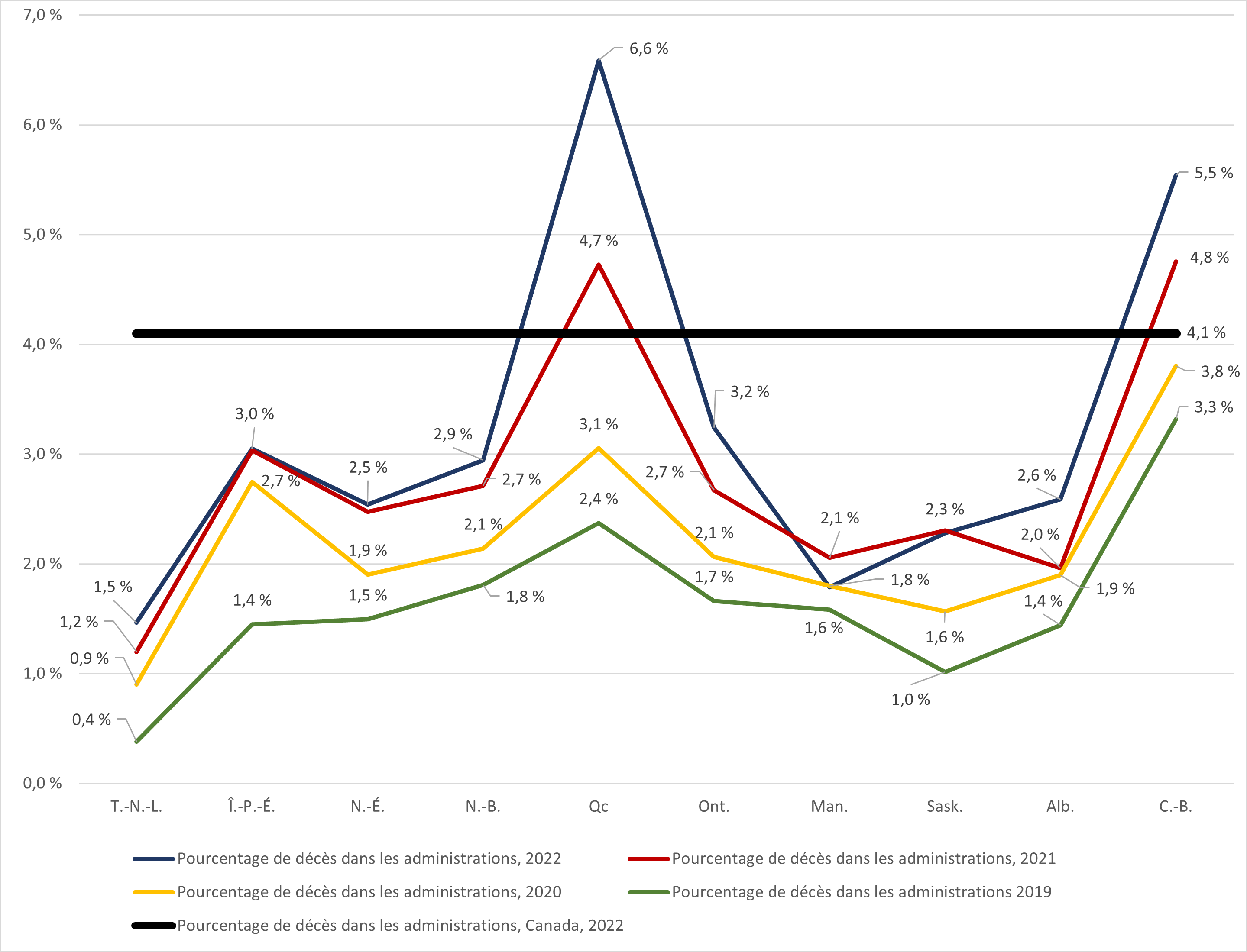 - En 2022, 13 241 cas d'aide médicale à mourir ont été déclarés au Canada, ce qui représente 4,1 % de tous les décès dans le pays.