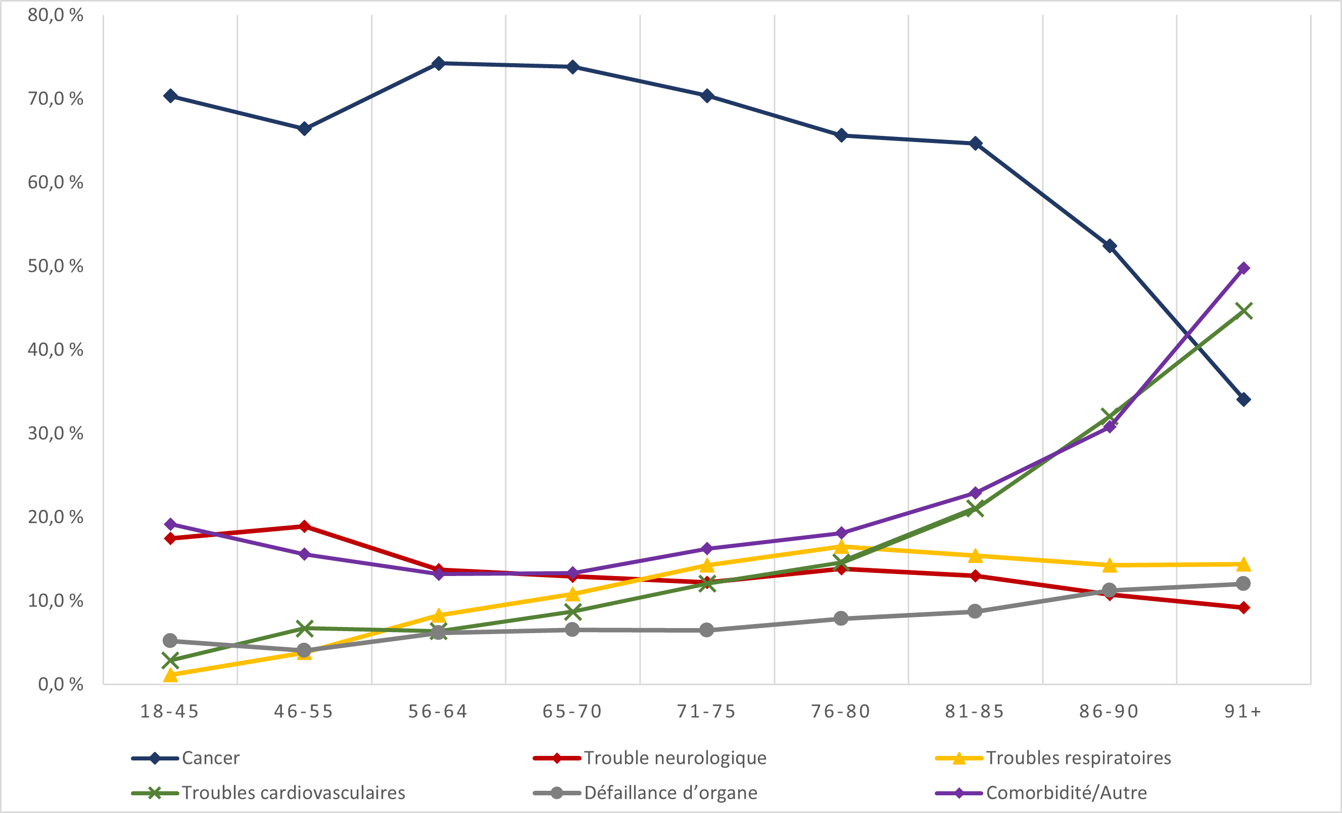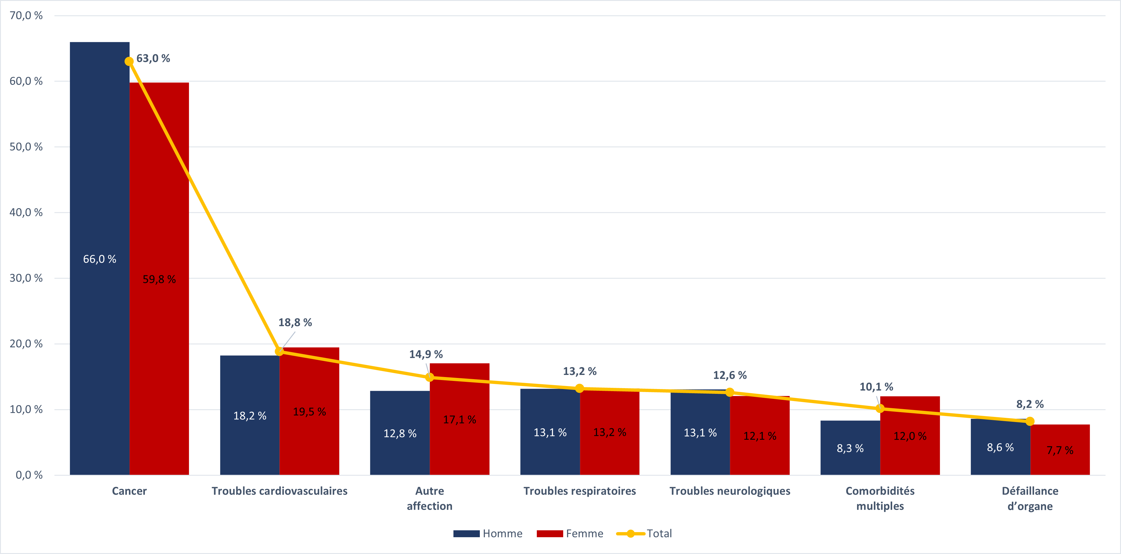 - Le cancer (63,0 %) est l'affection médicale sous-jacente la plus souvent citée parmi les cas d'aide médicale à mourir en 2022, soit une baisse par rapport à l'année 2021 (65,6 %) et à l'année 2020 (69,1 %). Viennent ensuite les troubles cardiovasculaires (18,8 %), les autres maladies (14,9 %), les maladies respiratoires chroniques (13,2 %) et les troubles neurologiques (12,6 %).