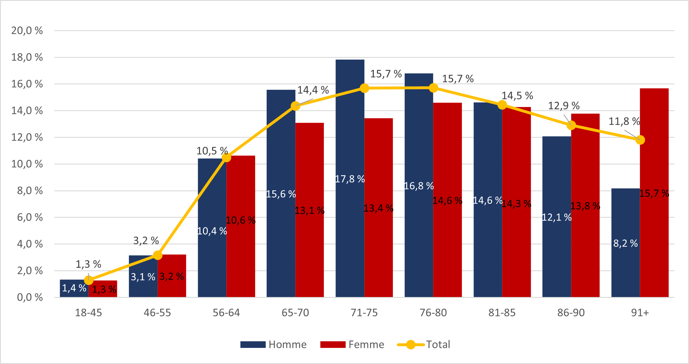 | 65 à 70 ans | 15 | 17,6 % | 6 | 14,6 % | 41 | 15,2 % | 48 | 21,4 % | 749 | 15,9 % | 478 | 12,2 % | 35 | 15,7 % | 31 | 12,1 % | 140 | 16,8 % | 339 | 13,5 % | - | - | - | - | - | - | |