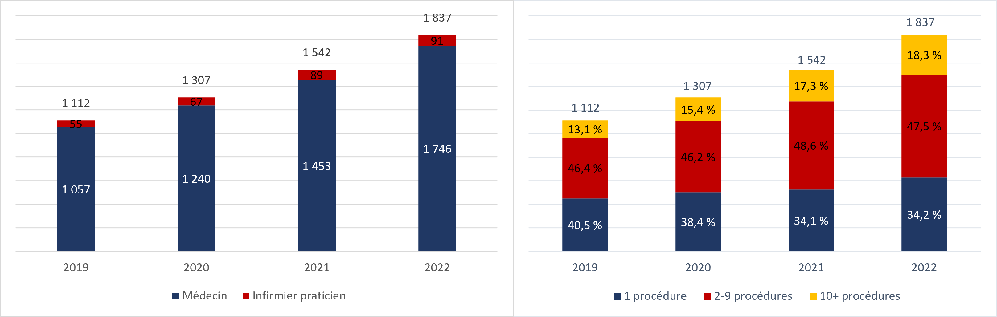 - Le nombre total de praticiens uniques administrant l'aide médicale à mourir est passé à 1 837 en 2022, soit une augmentation de 19,1 % par rapport aux 1 542 praticiens en 2021. Par ailleurs, 95,0 % de tous les praticiens administrant l'aide médicale à mourir étaient des médecins, tandis que 5,0 % étaient des infirmiers praticiens.
