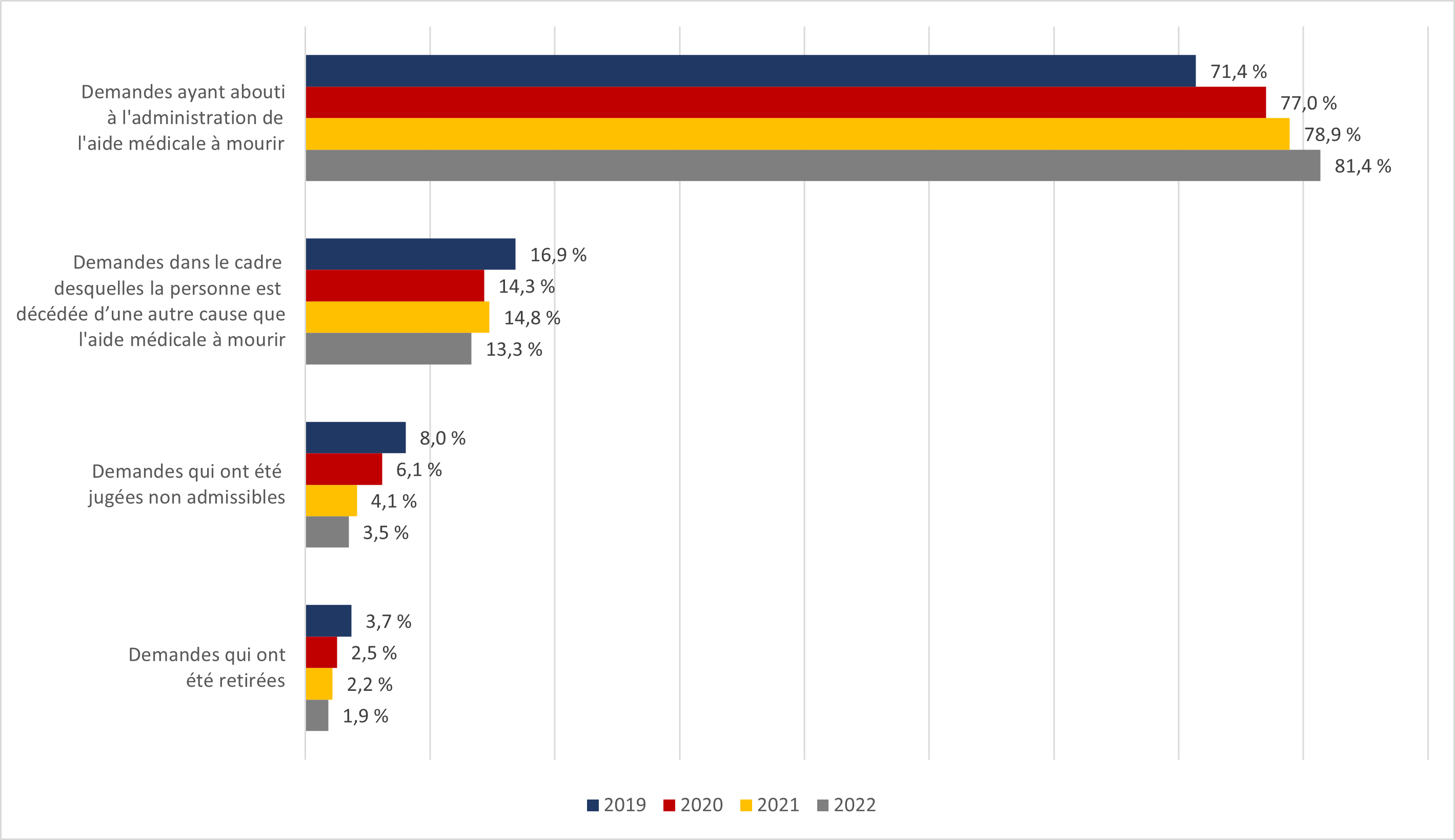 - Ces résultats continuent d'être très semblables à ceux des trois dernières années (2019 à 2021), ce qui indique que la nature de la souffrance conduisant une personne à demander une aide médicale à mourir est restée constante au cours des quatre dernières années.