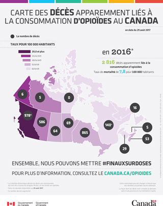 Carte : Décès apparemment liés à la consommation d'opioïdes au Canada (29 août 2017)
