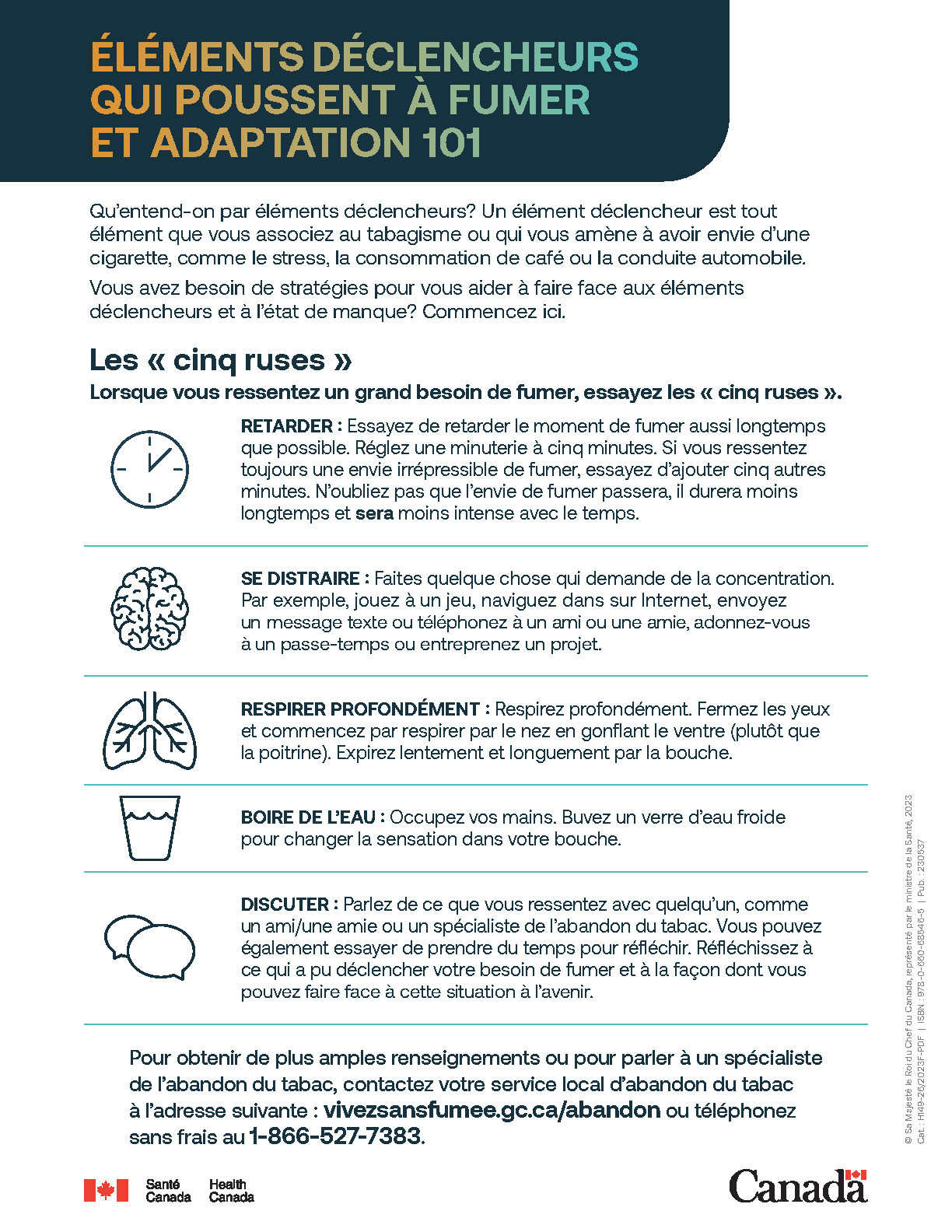 Pour obtenir de plus amples renseignements ou pour parler à un spécialiste de l'abandon du tabac, contactez votre service local d'abandon du tabac à l'adresse suivante : vivezsansfumee.gc.ca/abandon ou téléphonez sans frais au 1-866-527-7383.