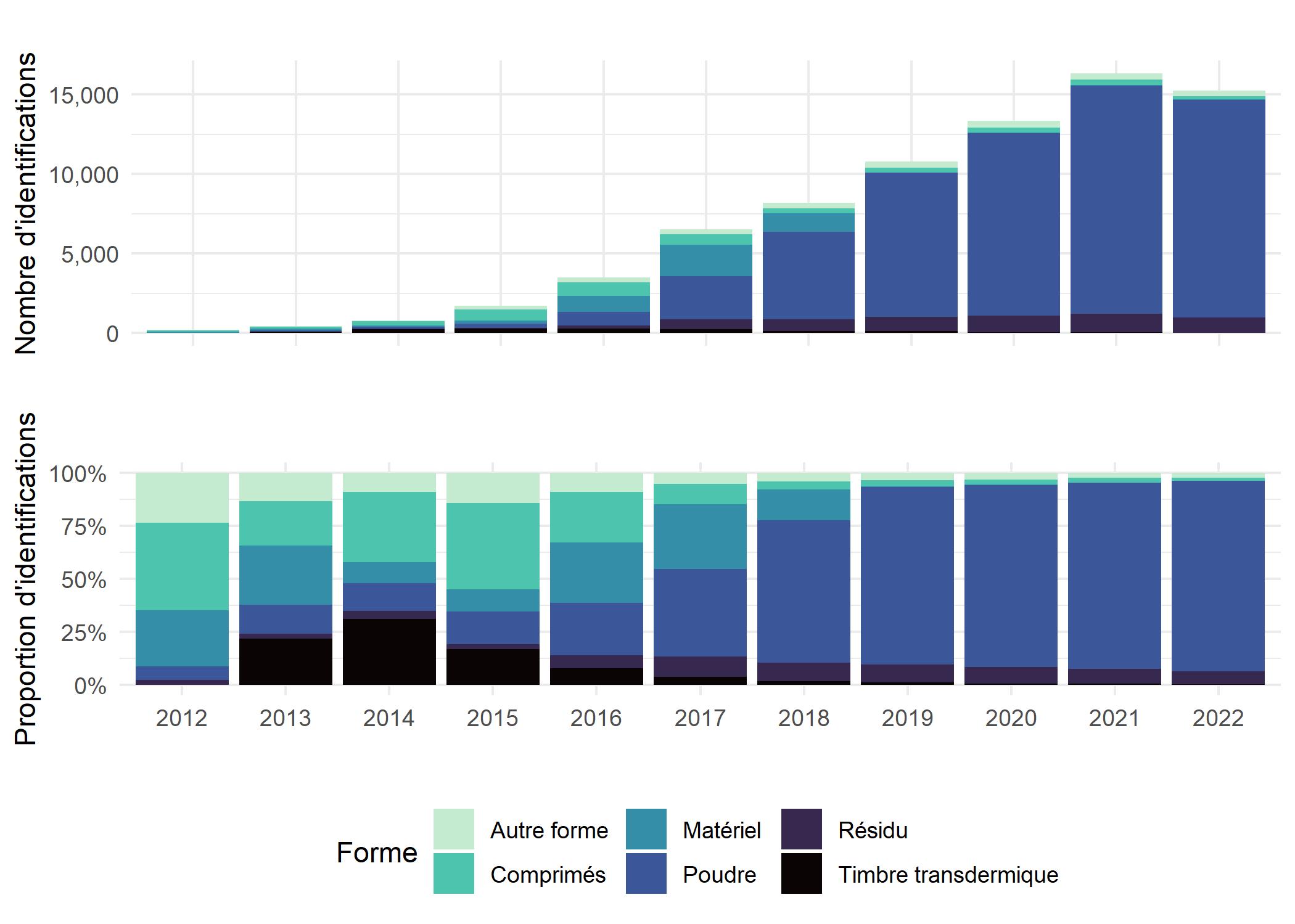 Néanmoins, en 2022, le fentanyl en poudre semble être la forme principale dans la plupart des provinces et territoires.