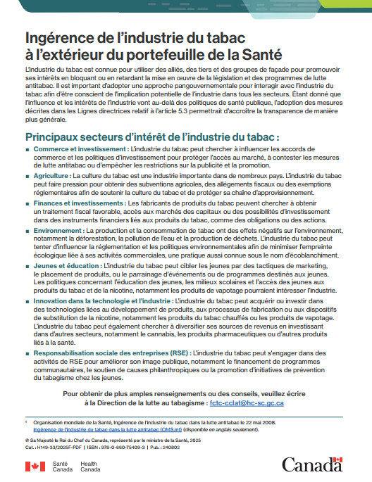 Pour obtenir de plus amples renseignements ou des conseils, veuillez écrire à la Direction de la lutte au tabagisme : fctc-cclat@hc-sc.gc.ca.