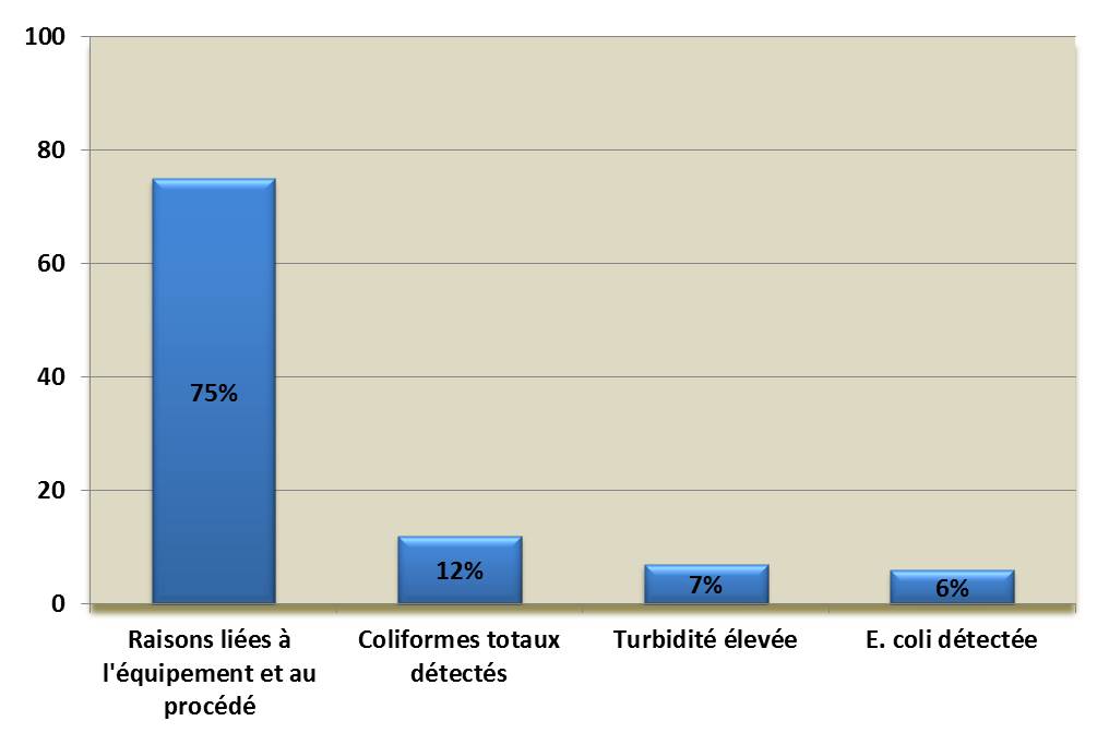 - Effectuer des recherches pour déterminer le problème et éviter qu'il se répète, et mesurer entre autres la qualité de l'eau brute (p. ex. caractéristiques bactériologiques, turbidité, couleur, matières organiques naturelles et conductivité) et sa variabilité;