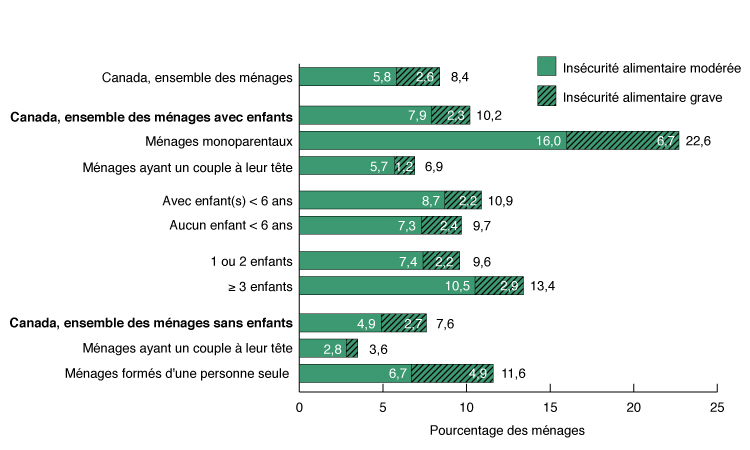 Au Canada, la prévalence globale de l'insécurité alimentaire était plus élevée dans les ménages comprenant des enfants (10,2 %) que dans les ménages sans enfants (7,6 %). Les ménages avec enfants comprenaient au moins un membre de 17 ans ou moins.