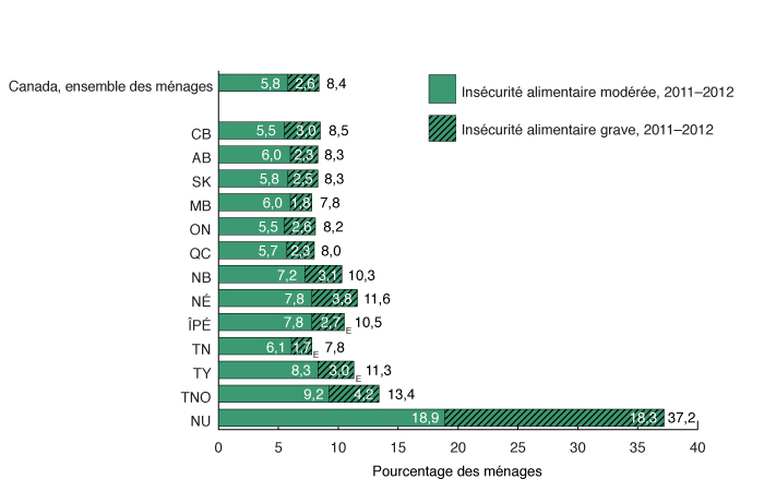 De 2011 à 2012, 8,4 % (1 098 900) des ménages canadiens étaient en situation d'insécurité alimentaire. La situation variait d'insécurité alimentaire modérée à insécurité alimentaire grave.