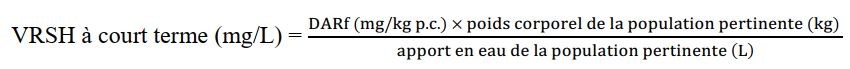 VRSH à court terme : Cette équation calcule la VRSH à court terme. La DARf (exprimée en mg/kg p.c.) d’un pesticide est multipliée par le poids corporel estimé (kg) de la sous-population canadienne visée, puis divisée par la quantité estimée d’eau potable ingérée (L/j) par cette sous-population. La VRSH est exprimée en mg/L.