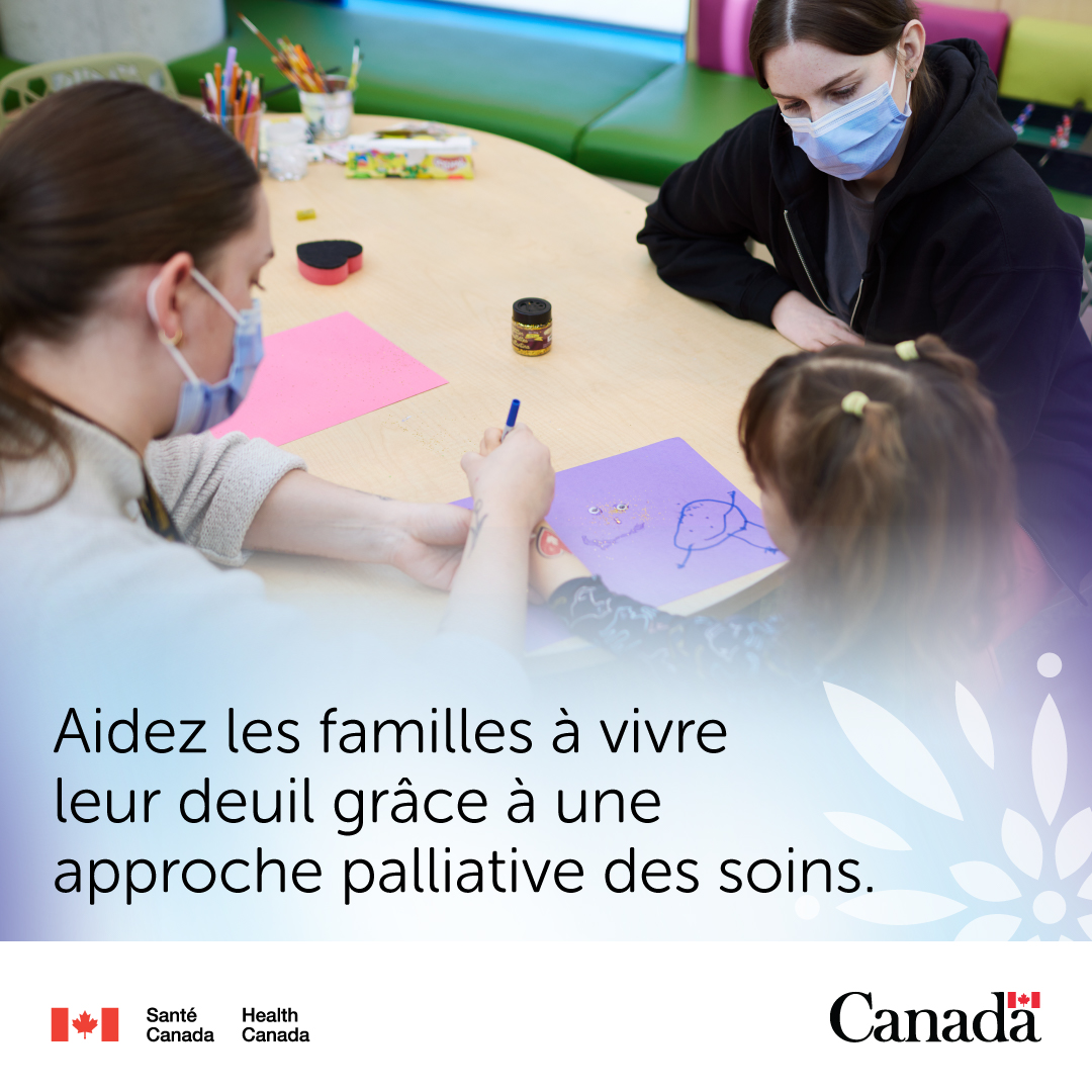 Vous pouvez aider les enfants ayant une ou plusieurs maladies graves et leur famille à vivre leur deuil en offrant une approche palliative des soins. Cette approche soutient leur bien-être émotionnel, physique, social et spirituel à chaque étape. Trouvez des ressources de soutien face au deuil à Canada.ca/soins-palliatifs. |