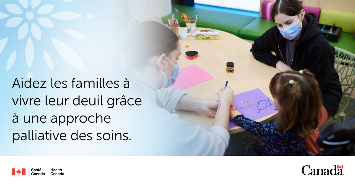 Vous jouez un rôle clé dans la prestation d'une approche palliative des soins aux enfants ayant une ou plusieurs maladies graves et à leur famille. En amorçant la conversation tôt et en offrant du soutien et des soins coordonnés, vous pouvez contribuer à améliorer leur qualité de vie. Trouvez des outils et des ressources à Canada.ca/soins-palliatifs. |