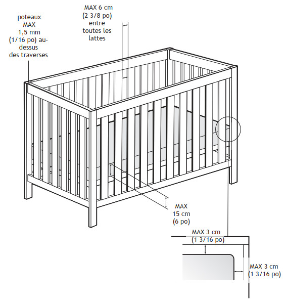 L’illustration montre un lit d’enfant et un matelas. L’image illustre les dimensions que les consommateurs doivent mesurer avant d’utiliser ou d’acheter un lit d’enfant. Elle pointe vers les sections du lit d’enfant. Le dessus d’un poteau du lit d’enfant indique que les poteaux ne doivent pas mesurer plus de 1,5 millimètre ou 1 seizième de pouce à partir du dessus des côtés du lit d’enfant. L’espace entre les barreaux ne doit pas dépasser 6 cm ou 2 pouces et 3 huitièmes. L’épaisseur du matelas doit se limiter à 15 cm ou 6 pouces. À droite au bas de l’image, un coin du lit d’enfant est en plan rapproché où il doit y avoir un écart maximal de 3 centimètres ou 1 pouce et trois seizièmes entre le matelas et les côtés du lit d’enfant.
