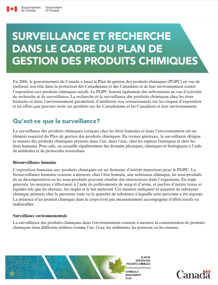 En 2006, le gouvernement du Canada a lancé le Plan de gestion des produits chimiques (PGPC) en vue de renforcer son rôle dans la protection des Canadiennes et des Canadiens et de leur environnement contre l'exposition aux produits chimiques nocifs. Le PGPC fournit également des subventions en vue d'activités de recherche et de surveillance. La recherche et la surveillance des produits chimiques chez les êtres humains et dans l'environnement permettent d'améliorer nos connaissances sur les risques d'exposition et les effets que peuvent avoir ces produits sur les Canadiennes et les Canadiens et leur environnement.