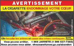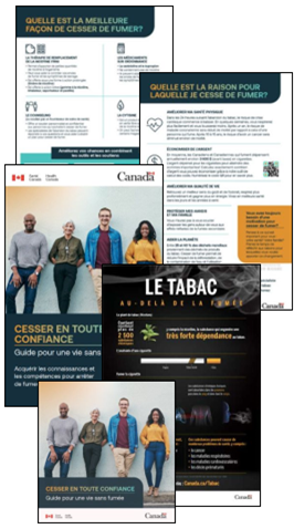 | Les messages liés à la santé de tous les emballages de produits du tabac : Avertissements sanitaires sur les emballages | Étiquettes et faits | Les écoles, les groupes et centres communautaires, et les cabinets de médecin | S.O. |