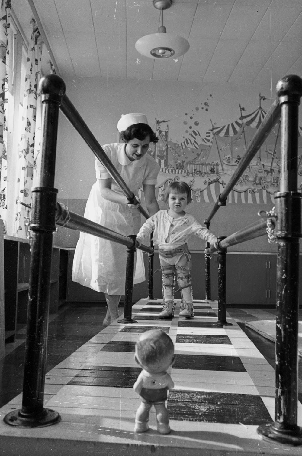 Mme E. Marr, physiothérapeute, avec Gifford, enfant de 2 ans 1/2, aux barres parallèles de la clinique de polio à l'Hôpital général de Sudbury