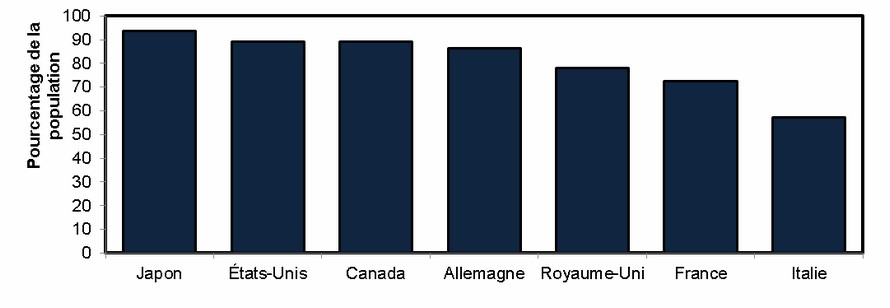 En 2012, le taux d'obtention du diplôme d'études secondaires au Canada était de 89 %, un taux identique à celui des États-Unis, et le deuxième plus élevé des pays du G7. C'est au Japon que ce taux était le plus élevé, soit 94 % (Figure 3)Note de bas de page 10.