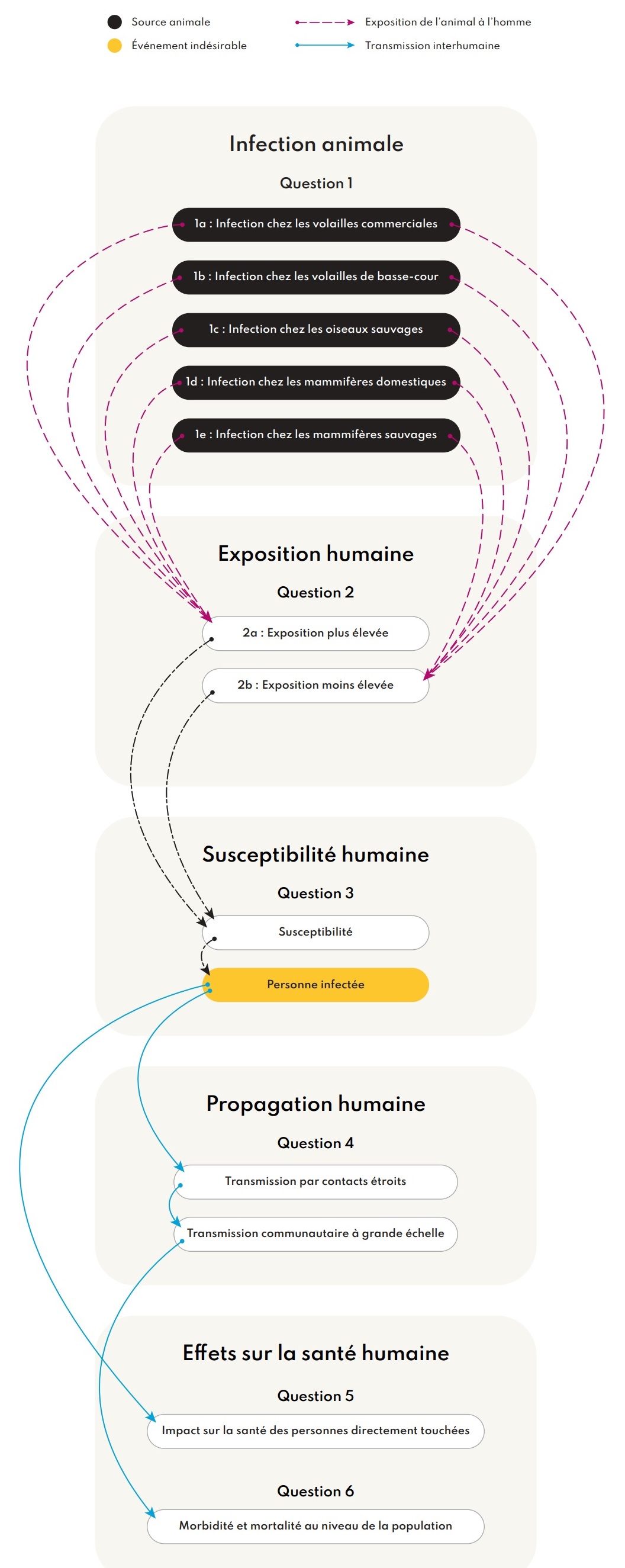 Cette évaluation des risques met l'accent sur le risque d'infection humaine par le virus de l'influenza aviaire A(H5N1) de clade 2.3.4.4b au Canada par suite d'expositions zoonotiques ou environnementales (en raison d'une contamination animale). Les risques d'exposition liés au contact avec un cas humain ne sont pas inclus. Si la transmission interhumaine devait se produire avec ce virus, une évaluation des risques distincte serait effectuée, qui inclurait de tels risques d'exposition, p. ex. ceux subis par les contacts étroits des cas et les travailleurs de la santé.
