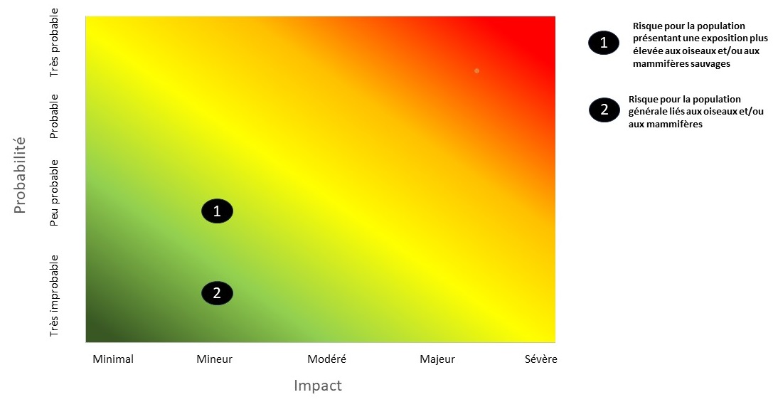 L'infection par le virus de l'influenza aviaire A(H5N1) de clade 2.3.4.4b acquise à partir des mammifères est très improbable pour la population générale ayant un niveau d'exposition plus élevé aux mammifères domestiques (p. ex. les chiens et les chats), mais ayant un niveau d'exposition moins élevé aux mammifères sauvages. Pour la population ayant un niveau d'exposition plus exposée aux mammifères sauvages (p. ex. carnivores sauvages et récupérateurs), l'infection est peu probable en raison de la faible proportion de mammifères sauvages infectés et de la capacité limitée du virus d'infecter les humains. Ces estimations comportent une incertitude modérée à élevée en raison d'une surveillance et d'essais limités des espèces de mammifères et de l'information limitée sur l'infectivité de ce clade chez l'humain.