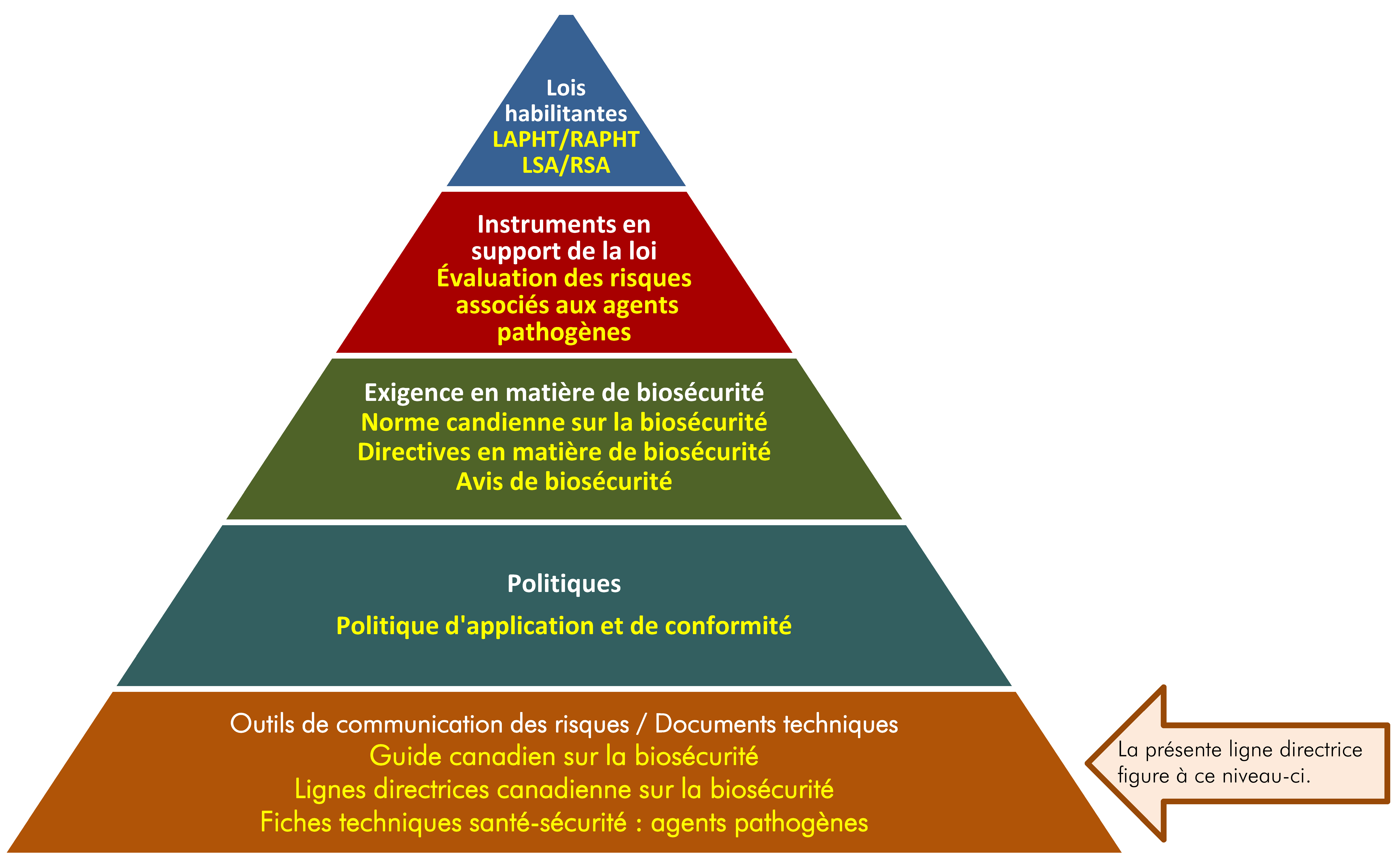 La figure suivante illustre la hiérarchie des documents qu’utilisent l’ASPC et l’ACIA pour surveiller les activités de biosécurité et de biosûreté. Chaque niveau de la pyramide correspond à un type de document. Les documents sont placés en ordre de priorité du haut de la pyramide vers le bas. La législation et les règlements se trouvent au sommet de la pyramide, car ce sont ces documents qui transmettent l’autorité légale à l’ASPC et l’ACIA. Le matériel d’orientation et les éléments techniques se trouvent au bas de la pyramide, car ils sont uniquement destinés à résumer les recommandations et les informations scientifiques.
