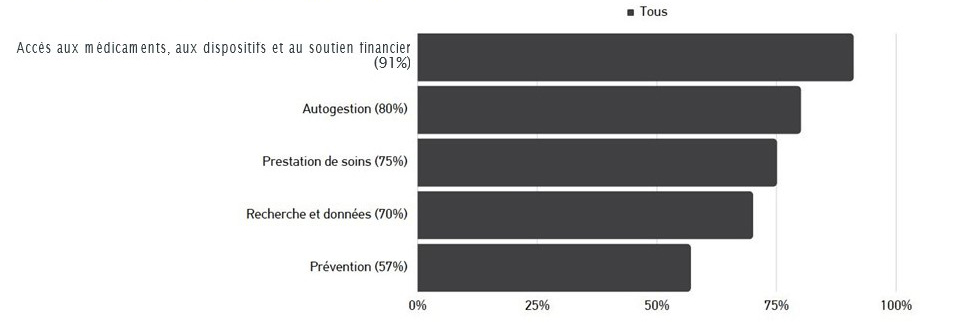 Dans les domaines d’action, les thèmes de la lutte contre la stigmatisation, de la formation des professionnels de la santé axée sur le patient, d’un meilleur soutien des outils d’autogestion, des réformes fiscales et de l’équité d’accès aux médicaments et aux dispositifs médicaux ont été bien classés. Il y a eu peu de variations entre les régions, les rôles ou les groupes d’âge.