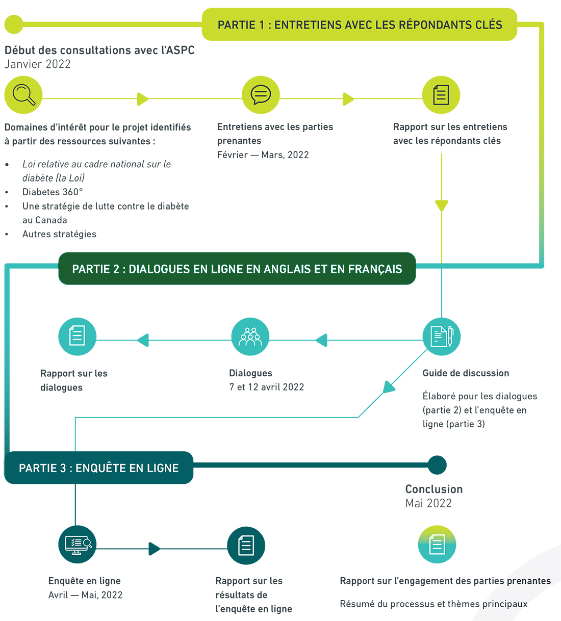 Partie 1 (en jaune) : Les consultations avec l’ASPC ont commencé en janvier 2022 pour déterminer les principales ressources à examiner afin de déterminer les domaines d’intérêt du projet. Ces ressources clés comprenaient le projet de loi C-237, Diabète 360° : Un cadre pour une stratégie sur le diabète pour le Canada, ainsi que d’autres stratégies et documents. Des entretiens avec les intervenants ont été menés en février et mars 2022 et un rapport sur les entretiens avec les informateurs clés a été rédigé.