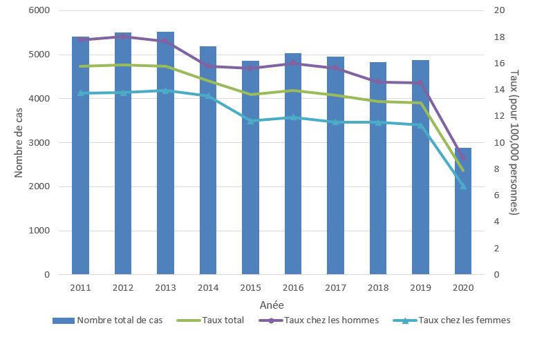 | Année | Nombre total de cas (n) | Cas masculins (n) | Cas féminins (n) | Taux total (pour 100 000 personnes du Canada) | Taux chez les hommes (pour 100 000 hommes) | Taux chez les femmes (pour 100 000 femmes) |