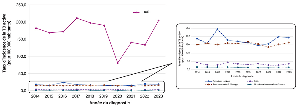 Le côté gauche montre l’incidence de la TB dans différents sous-groupes de population au Canada de 2014 à 2023, les Inuit affichant systématiquement des valeurs de l’ampleur de 80,5 à 204,2 cas pour 100 000 personnes, et rendant difficile l’évaluation complète des différences dans les valeurs d’incidence plus faibles (moins de 25,0 cas pour 100 000) enregistrées par d’autres sous-groupes de population (comme les Premières Nations, Métis, personnes nées à l’extérieur du Canada et personnes nées au Canada non autochtones) sans le grossissement de l’échelle telle que présentée dans le côté droit.