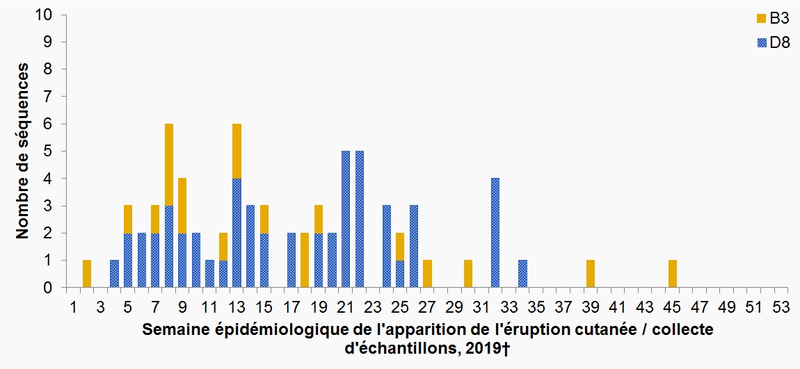 En 2019, soixante-treize (73) cas de rougeole ont été génotypés et les génotypes étaient B3 (n = 20) et D8 (n = 53), les deux circulant à l'échelle mondiale.