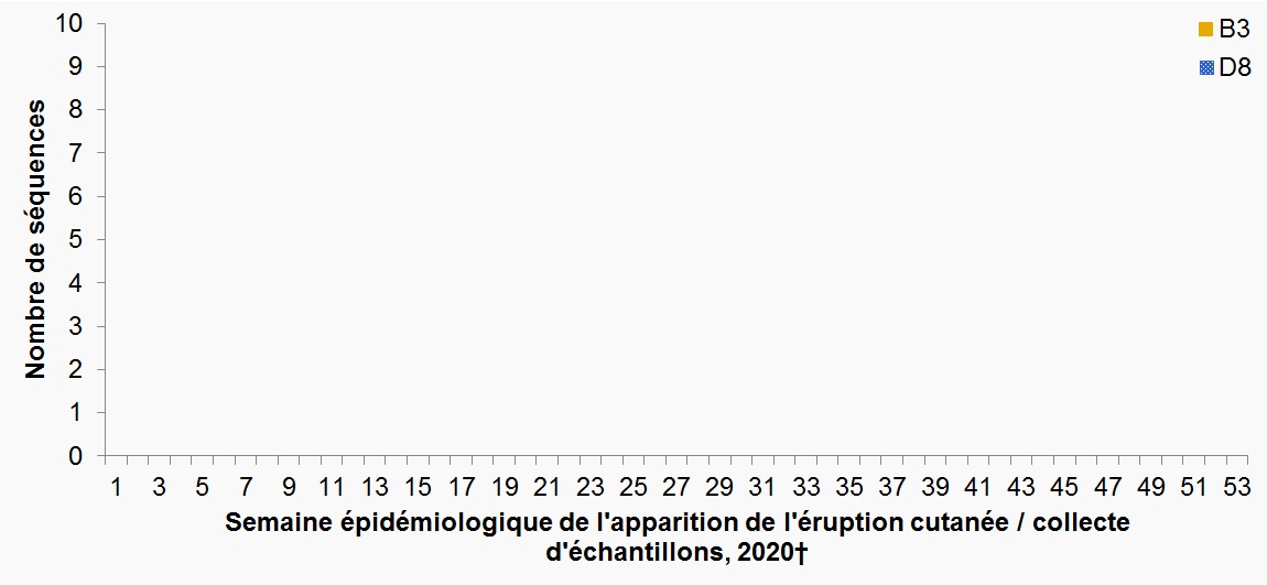 Les semaines épidémiologiques pour les échantillons de laboratoire soumis au Laboratoire national de microbiologie sont attribuées et consignées conformément aux directives de l'OMS (WHO.WER.2012; 9 (87): 73). La semaine 1 commence le premier lundi de l'année, soit le 6 janvier 2020. Cependant, aux fins du présent rapport, les données sur le génotype sont présentées conformément aux semaines de notification de l'OPS, où la première semaine de 2020 débute le 29 décembre 2019).