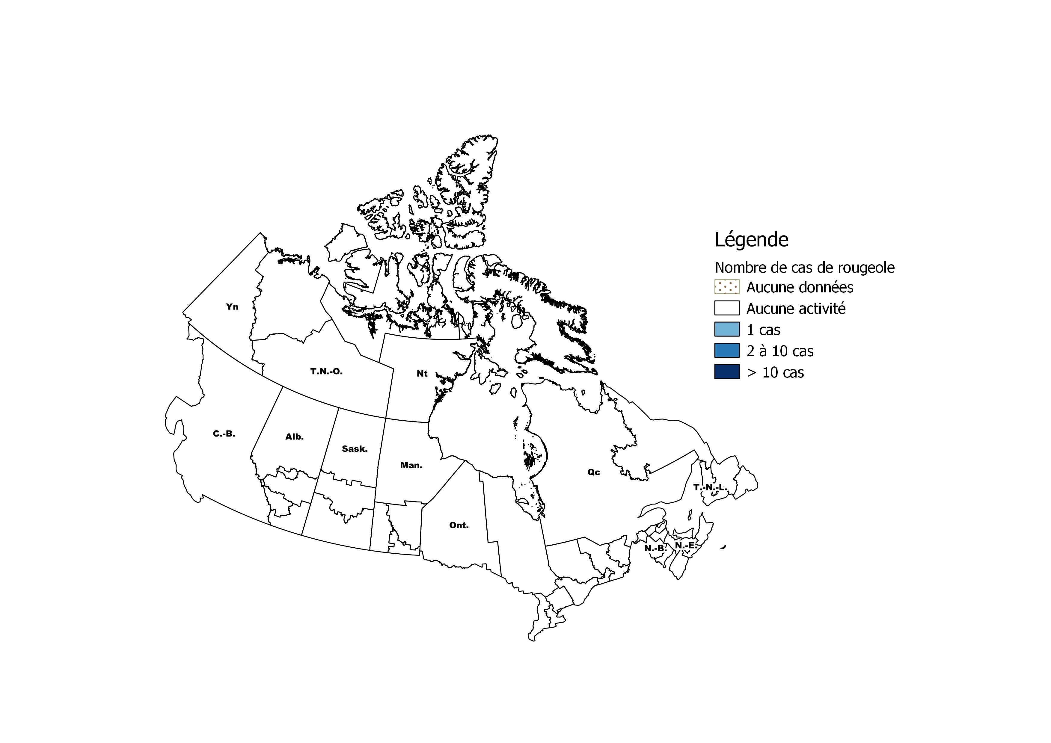 - Il n’existe actuellement aucun cas de rougeole ni de rubéole actifNote de bas de page 1 au Canada.