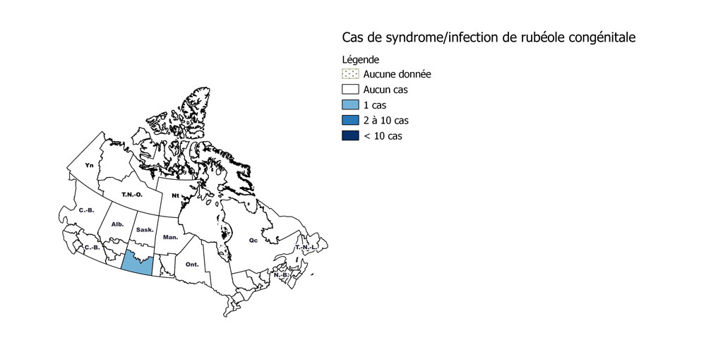 À l'heure actuelle, il y a 1 cas actifNote de bas de page ** de syndrome de rubéole congénitale et aucun cas actifNote de bas de page * de rougeole ni de rubéole au Canada.