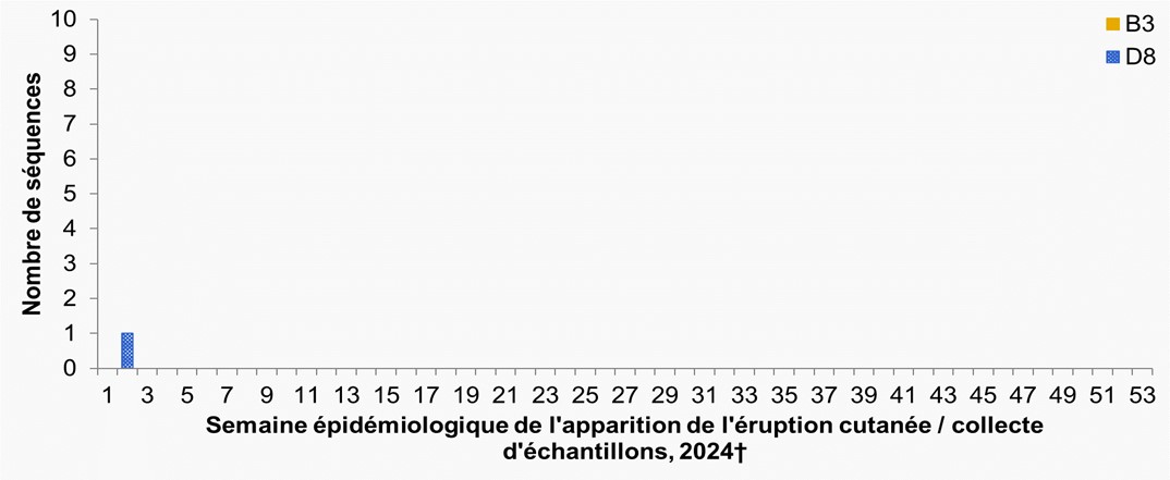 Les semaines épidémiologiques pour les échantillons de laboratoire soumis au Laboratoire national de microbiologie sont attribuées et consignées conformément aux directives de l'OMS (WHO.WER.2012; 9 (87): 73). La semaine 1 commence le premier lundi de l'année, soit le 1 janvier 2024. Cependant, aux fins du présent rapport, les données sur le génotype sont présentées conformément aux semaines de notification de l’OPS, où la première semaine de 2024, débute le 31 décembre 2023.
