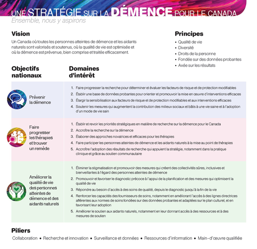 Vision : Un Canada où toutes les personnes atteintes de démence et les aidants naturels sont valorisés et soutenus, où la qualité de vie est optimisée et où la démence est prévenue, bien comprise et traitée efficacement.