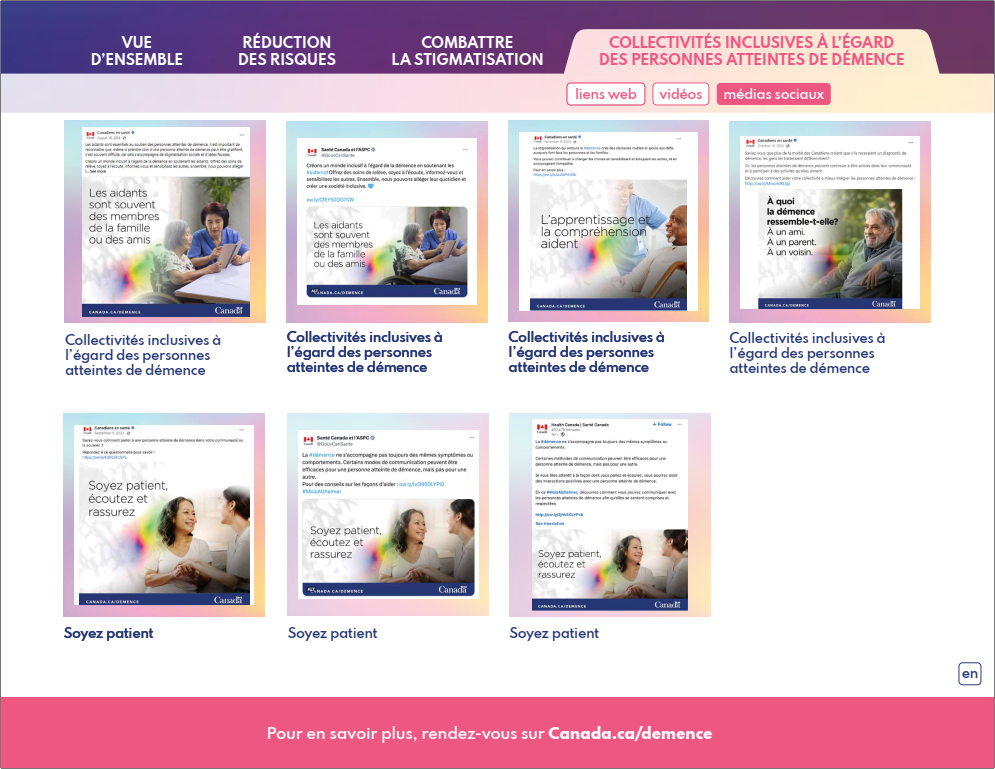 Earnscliffe Strategy Group pour l'Agence de la santé publique du Canada. Comprendre les attitudes et les connaissances des Canadiens pour promouvoir des collectivités inclusives à l'égard des personnes atteintes de démence qui sont sécuritaires et solidaires : Rapport final. Agence de la santé publique du Canada. 2023. Disponible sur : https://epe.bac-lac.gc.ca/100/200/301/pwgsc-tpsgc/por-ef/public_health_agency_canada/2023/133-22-f/index.html