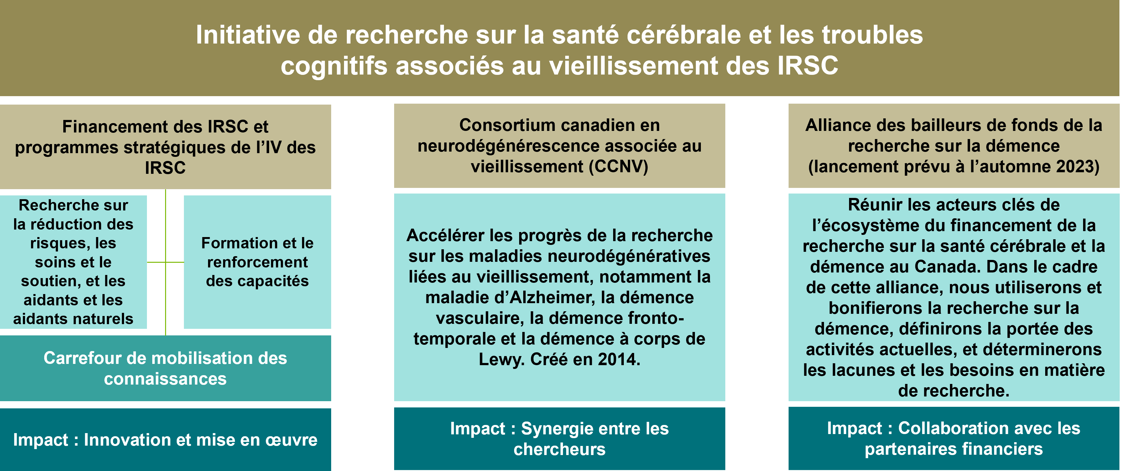 Ce montant représente exclusivement l'investissement alloué par le biais du premier pilier de l'Initiative de recherche sur la santé cérébrale et les troubles cognitifs liés au vieillissement (SCTV), comme illustré à la figure 6, soit les programmes stratégiques de l'Institut du vieillissement des IRSC. Il n'inclut pas le financement du Consortium canadien en neurodégénérescence associée au vieillissement (CCNV) ni celui de l'Alliance des bailleurs de fonds pour la recherche et l'innovation sur la démence, représentés respectivement par le deuxième et le troisième pilier de la figure 6.